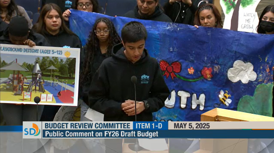 Youth Council returned to City Hall on May 5, 2025 for the FY26 proposed budget hearing to advocate for funding for Officer Jeremy Henwood Memorial Park in City Heights. Their advocacy for the past two and a half years has resulted in receiving $1.75 million from the City of San Diego's budget. The funds will be used to upgrade the 2-5 children's playground at the park. However, $2.5 million is needed to fund the 5-12 year old playground at Henwood Park.